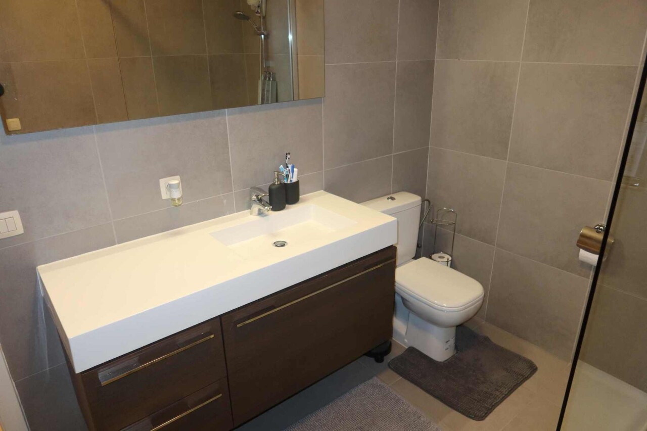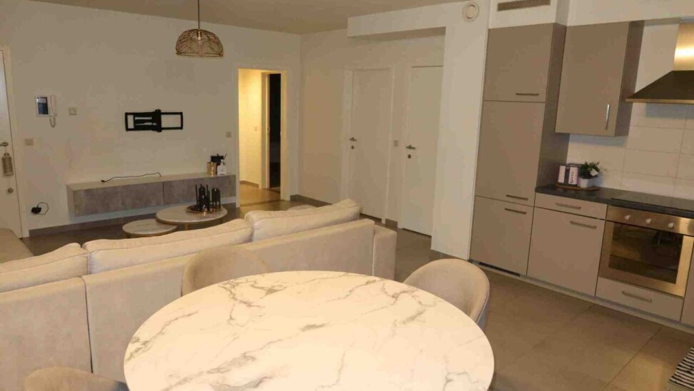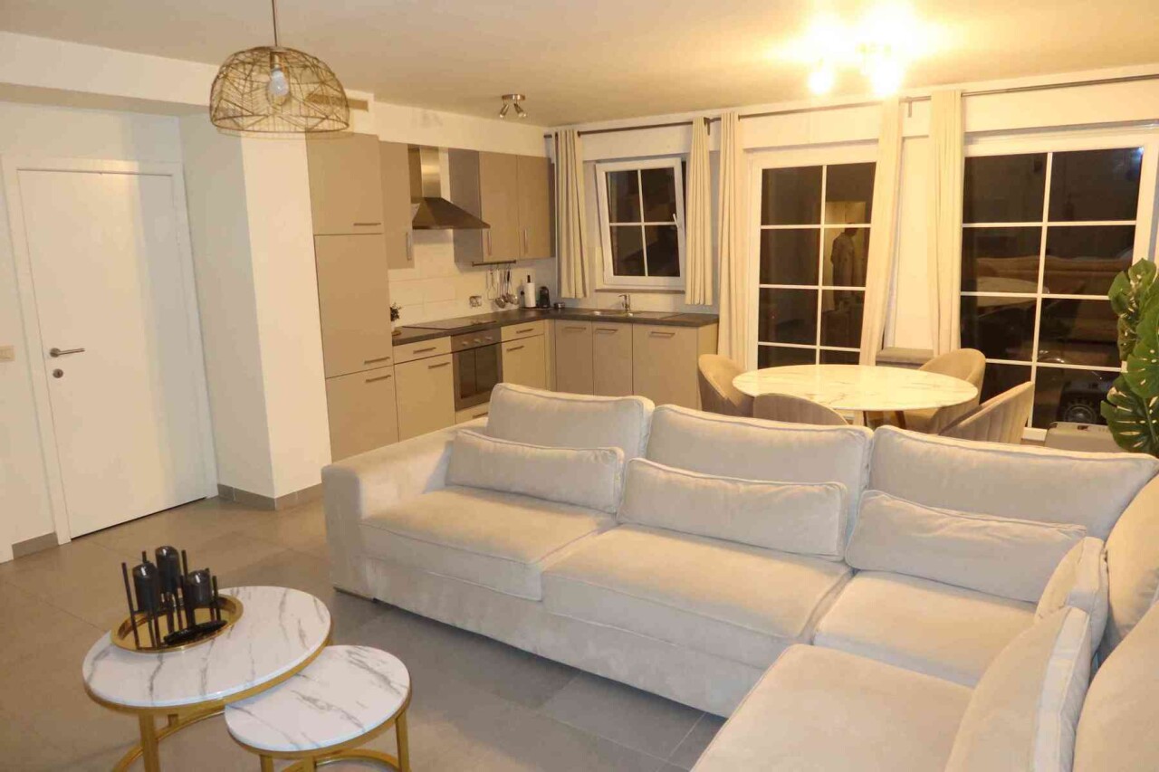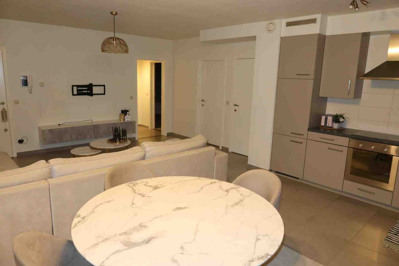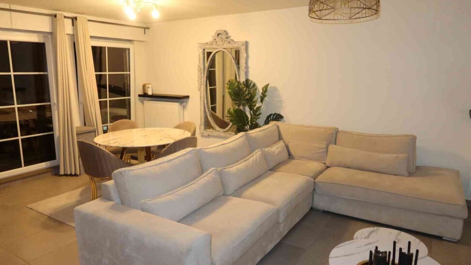 Super ruim en mooi gelijkvloers appartement bestaande uit een inkom met vestiaire kast, een apart toilet, zeer ruime living met open keuken (met alle toestellen), een erg ruime berging, 2 slaapkamers, badkamer met douche en meubel, overdekt terras (via de grote slaapkamer) en gemeenschappelijke fietsenberging.