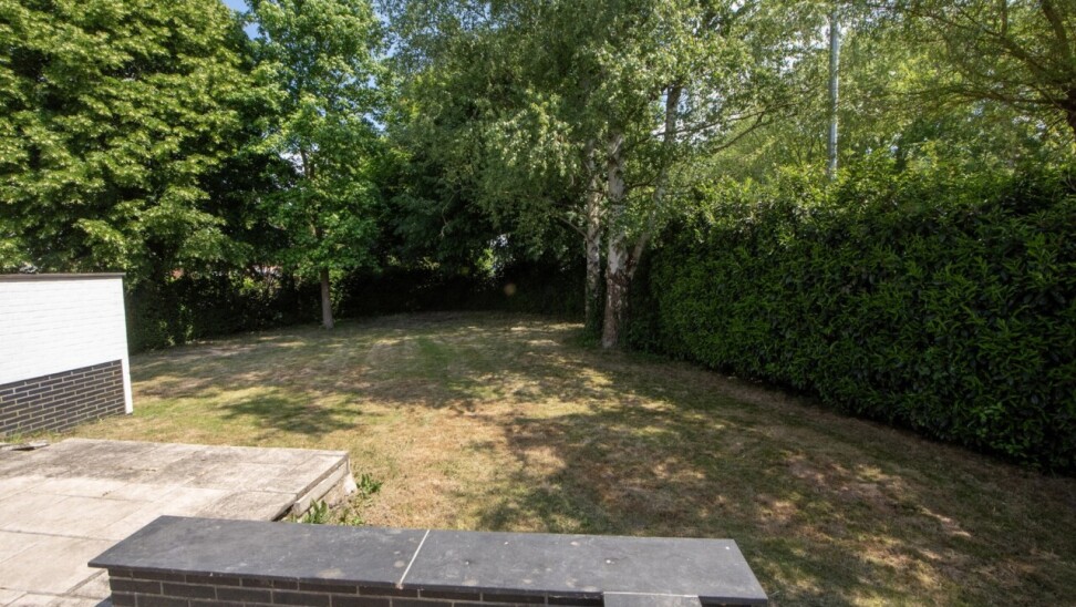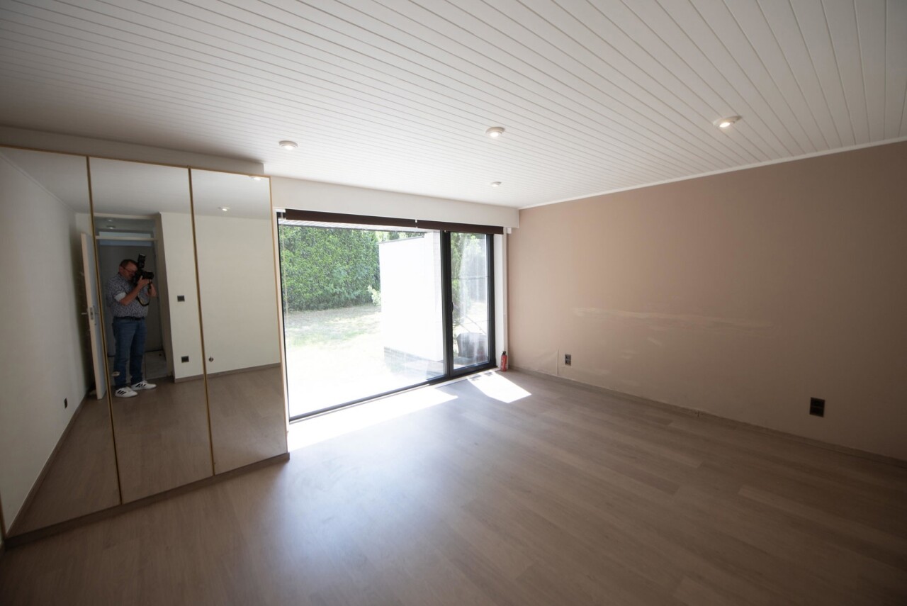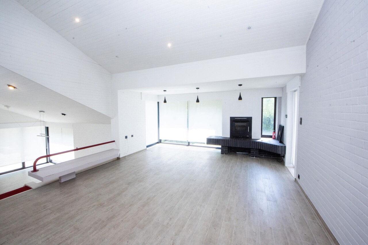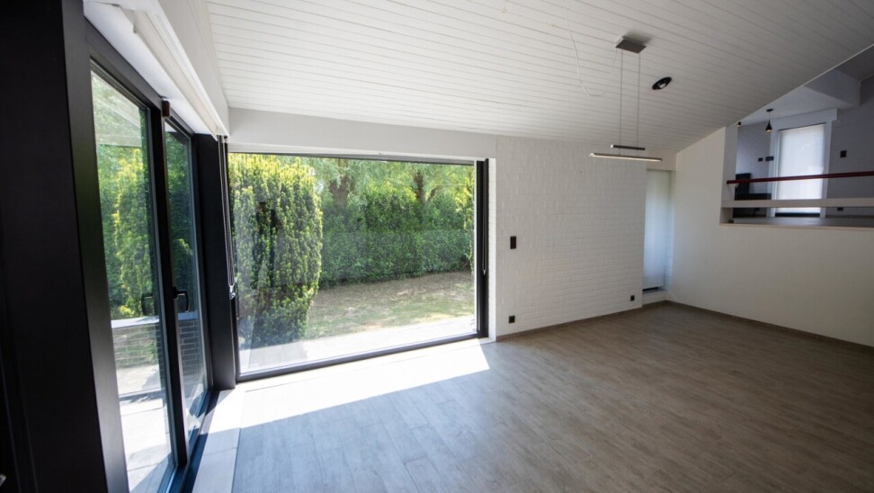 - Tussenverdieping: prachtige living met zitkuil, baadt in het licht en biedt een sfeervol uitzicht op de aangelegde tuin.