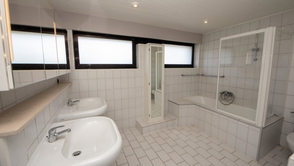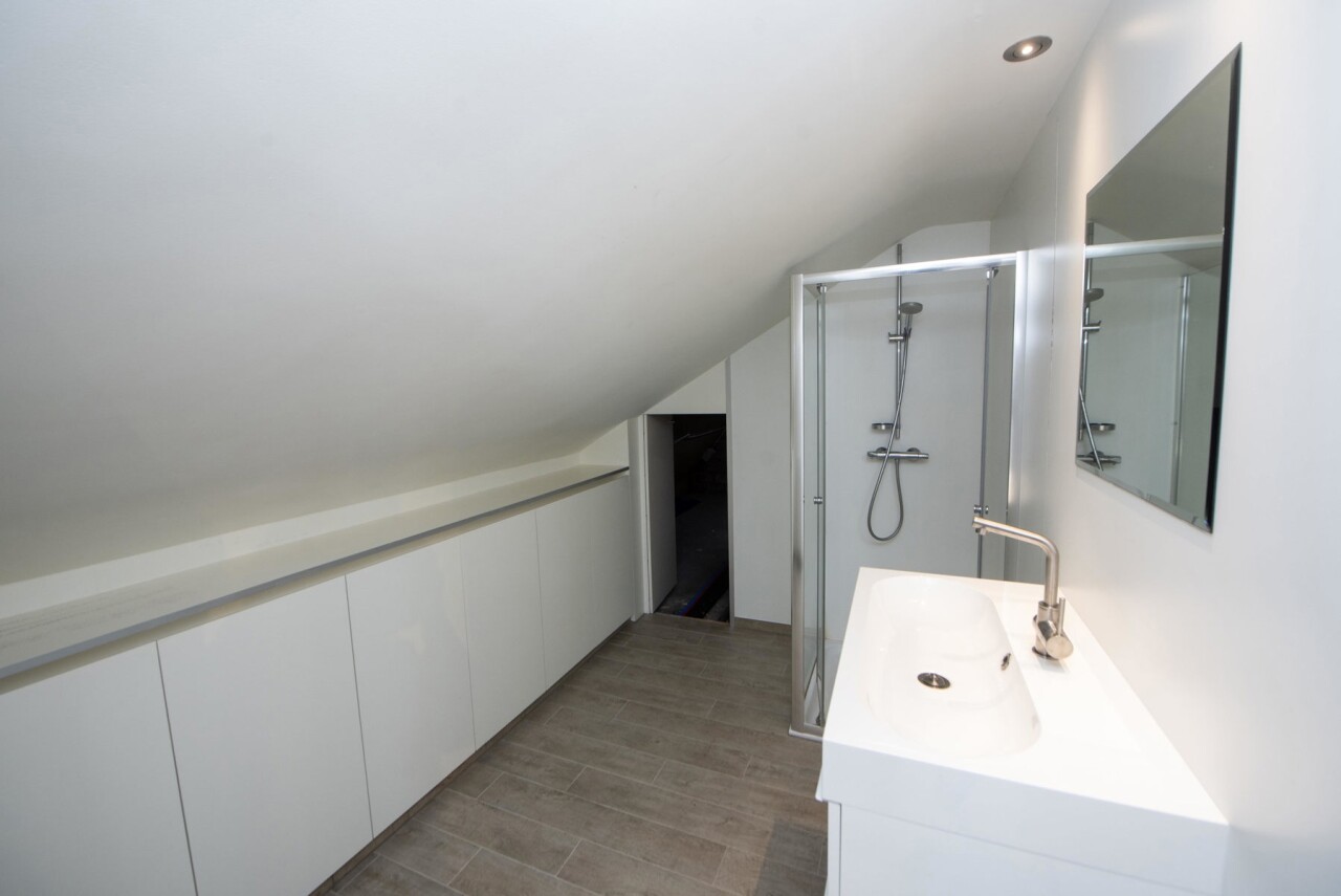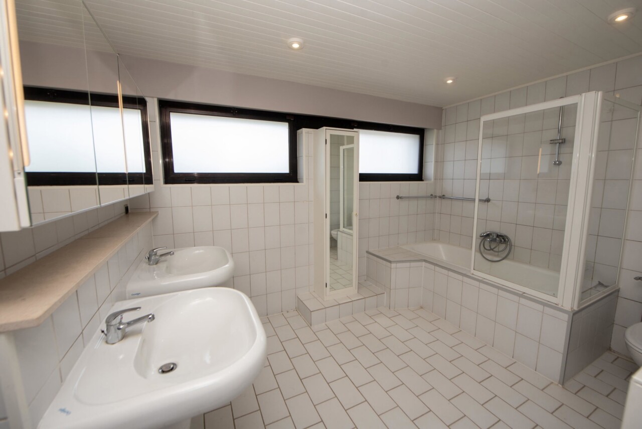 - Eerste verdieping: royale, lichtrijke inkomhal met apart gastentoilet, volledig uitgeruste keuken met berging.